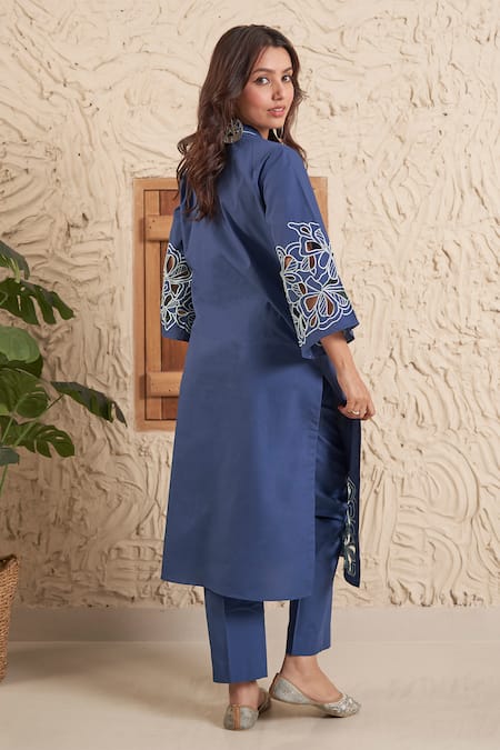 Blue straight kurta featuring floral cutwork and thread embroidery. Paired with solid straight pant.