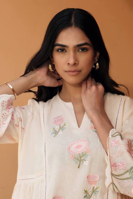 Pastel pink mulmul kurta featuring 3/4th sleeves with machine embroidery of flamingos and florals. Paired with straight pants and a breezy dupatta for a complete look.