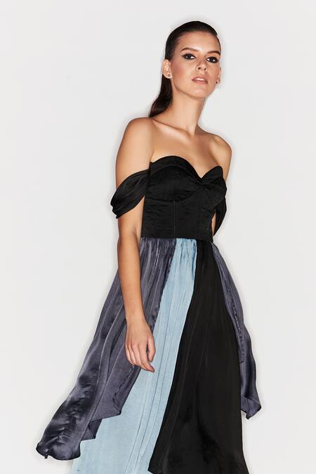 Black Satin Colorblock Off Shoulder Dress