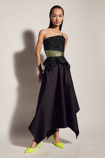 Black mystic one shoulder dress with confetti recycled peplum style top, asymmetrical hem and neon trim at the waistband.