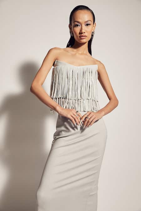 Luna opal strapless bodycon gown with layered faux leather fringe detail in the front.