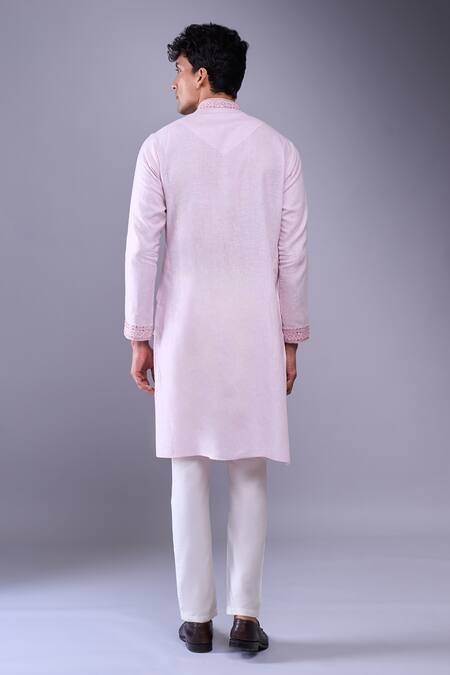 Baby pink straight kurta featuring mirror and thread embroidery on the placket and sleeve hem