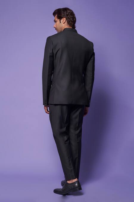 Black bandhgala featuring a Mandarin collar and full sleeves. Paired with matching pant and designed with welt pockets.