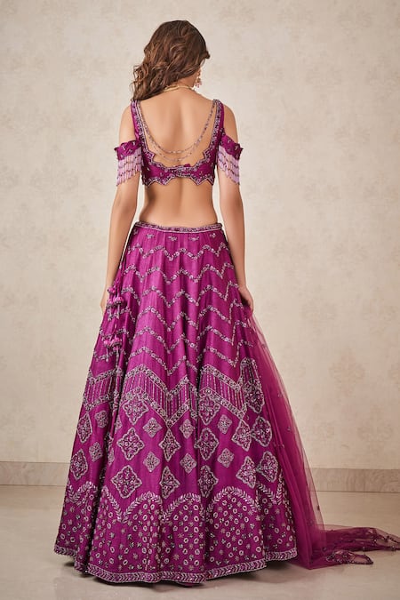 Plum lehenga featuring hand-embroidered crystals and an attached cancan. Paired with a padded cold-shoulder blouse and a scalloped tulle dupatta.