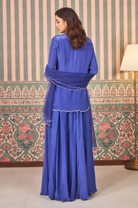 Blue kurta featuring floral applique, beads, and pearl tassels embroidered yoke with scallop edged detailing. Paired with a coordinating solid flared sharara and scallop embroidered dupatta.