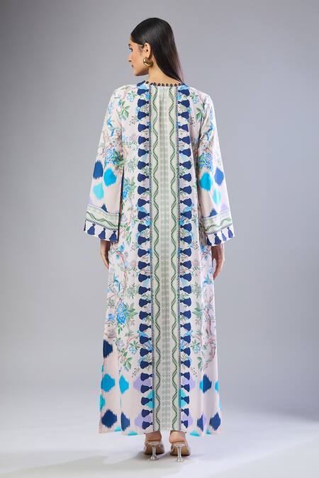 Blue maxi dress featuring floral prints and a front placket with intricate detailing