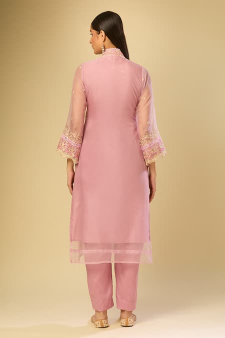 Pink Organza Embroidery V-neck Kurta Set