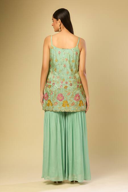 Green kurta featuring floral sequin embroidery and a straight silhouette. Paired with matching palazzo pants for a coordinated look.