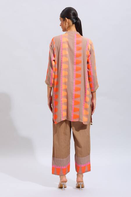 Brown kurta featuring multi color mirror work and tassel detailing. Paired with straight pants that complement the kurta's vibrant design.