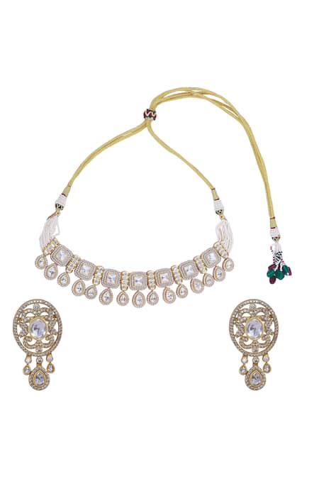 White and gold necklace featuring intricate brass work with embellishments. Paired with matching earrings adorned with cut stones for a cohesive look.