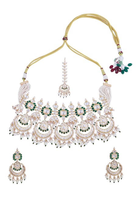 Buy_Nazaakat By Samara Singh_Green Stones, Pearls Brass And White Jewellery Set