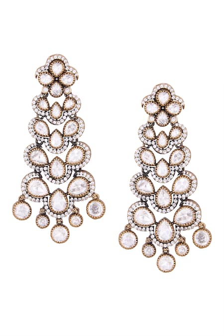 Gold and white dangler earrings featuring intricate detailing and a push back closure