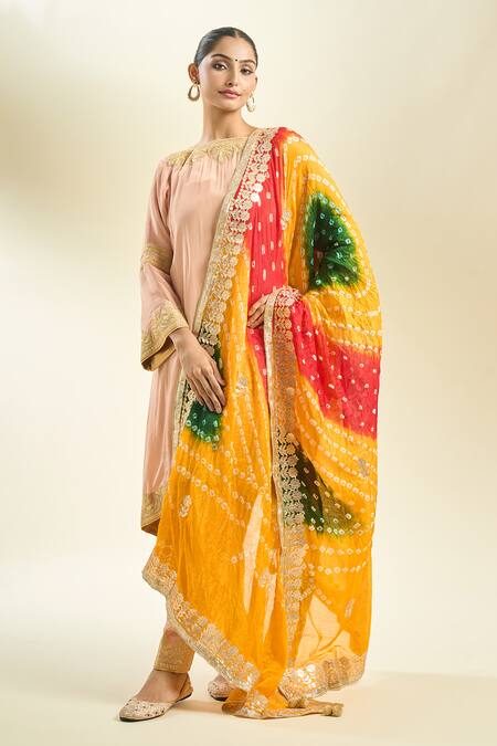 Multi color dupatta featuring a vibrant tie-dye bandhani pattern with intricate golden embroidery