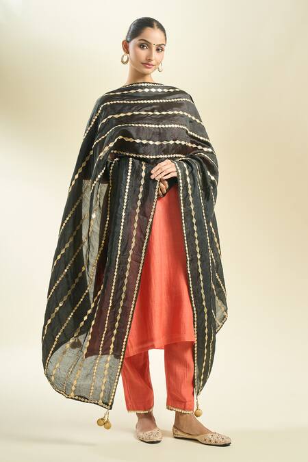 Black dupatta in a silk blend featuring golden stripes and tassel details