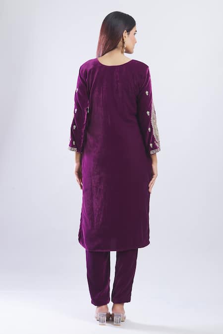 Buy_Samyukta Singhania_Purple Velvet Embroidery Round Neck Heavy Kurta Set With Dupatta