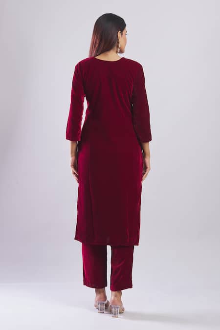 Buy_Samyukta Singhania_Maroon Velvet Embroidery Round Neck Kurta Set With Dupatta
