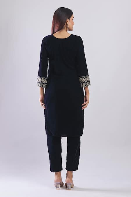 Navy Velvet Embroidery V-neck Blue Kurta Set With Dupatta