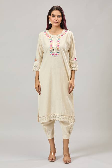 Buy_Samyukta Singhania_White Cotton Embroidery Round Neck Kurta Set