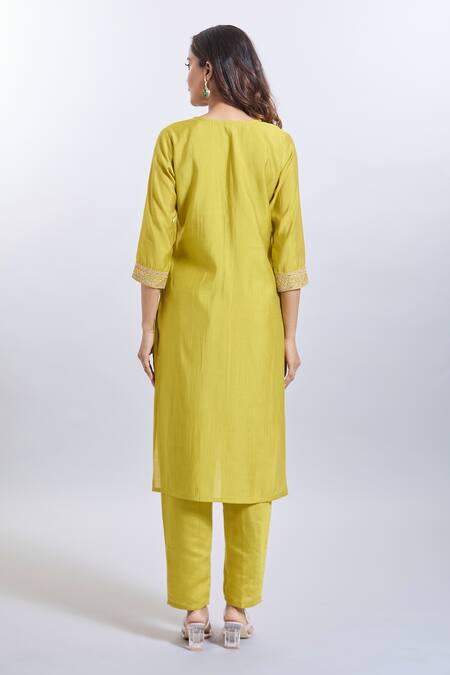 Yellow Viscose, Organza Embroidery V-neck Kurta Set
