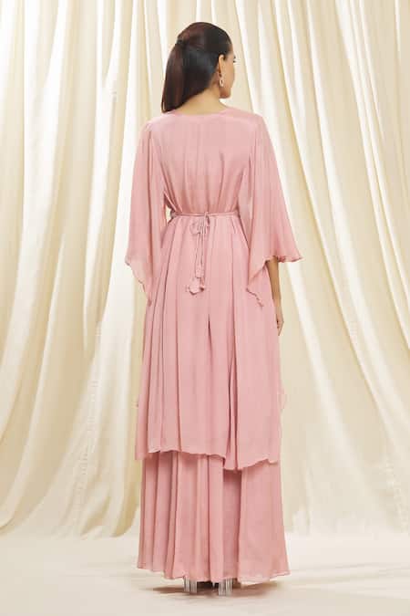 Peach chiffon top featuring a round neckline, aari hand embroidery, and cape sleeves. Paired with a knife pleated skirt and aari work belt.