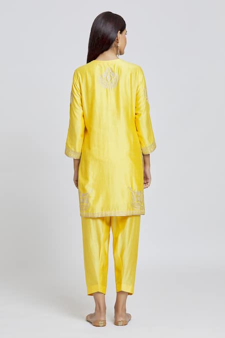 Yellow Silk, Chanderi, Organza Gota Patti, Embroidery Aari Work Kurta Pant Set