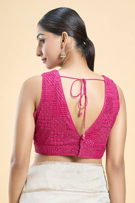 Pink saree blouse featuring a plunge-V neckline with intricate thread and stone work in an abstract geometric pattern