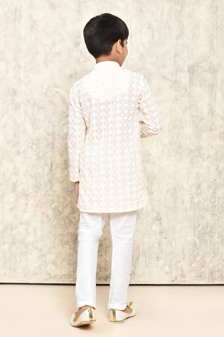 Pink kurta featuring full sleeves and Mandarin collar with all over amaryllis thread embroidery. Paired with a white pant for a complete set.