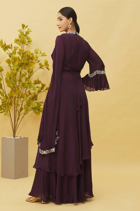 Wine chinon tunic featuring floral, sequins and thread embroidered borders. Paired with a flowy skirt and a detachable belt.