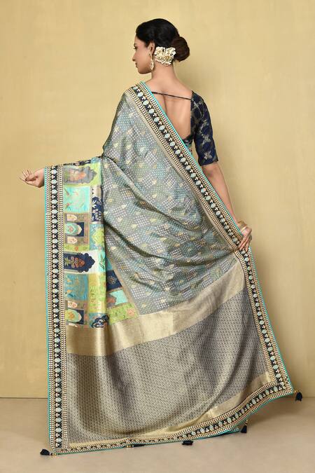 Buy_Samyukta Singhania_Green Denim, Silk Embroidery Bandhani And Mughal Pattern Saree With Running Blouse_Online_at_Aza_Fashions