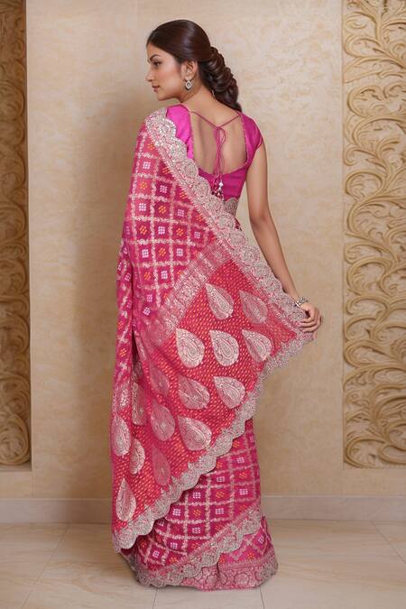 Pink Georgette Gota Patti, Zari Round Neck Bandhani Pattern Banarasi Saree