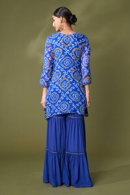 Blue straight kurta featuring bandhej print and gota embroidery. Paired with a sharara and embroidered dupatta.