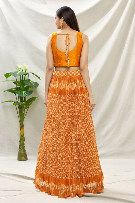 Mustard yellow lehenga featuring bandhani print with embroidered details. Paired with a raw silk mirror work choli and a matching dupatta.