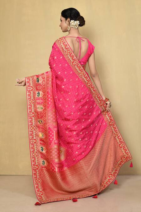Purple bandhani printed saree featuring Mughal woven motifs and an embroidered border. It includes a tassel pallu for added elegance.