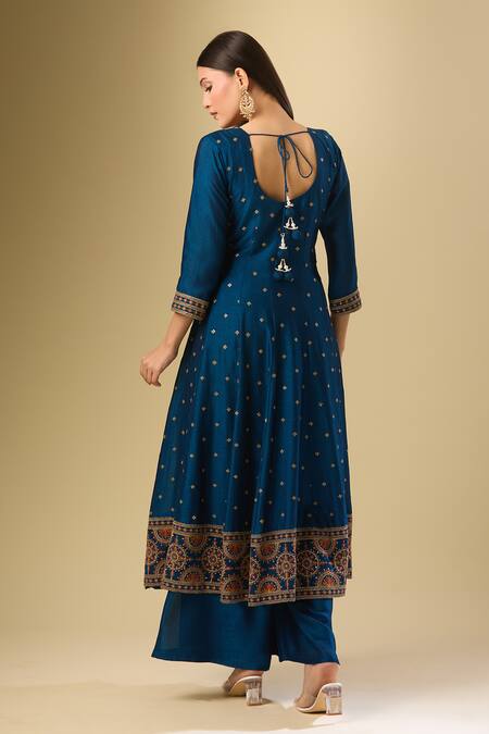Blue Silk Sequins, Zari, Embroidery Round Neck Bloom Kurta Palazzo Set