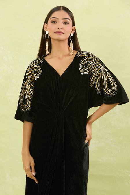 Black Velvet Sequins, Cut Work V-neck Embellished Kurta Set