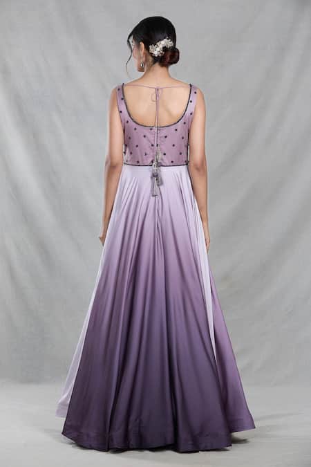 Purple and pink shaded gown featuring floral bloom embroidery with black toned beads, cutdana, and sequins on the bodice. Accompanied by a black border organza dupatta.