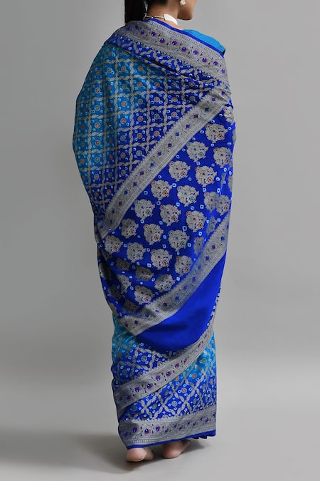 Blue silk Banarasi saree featuring intricate weaving Bandhej work