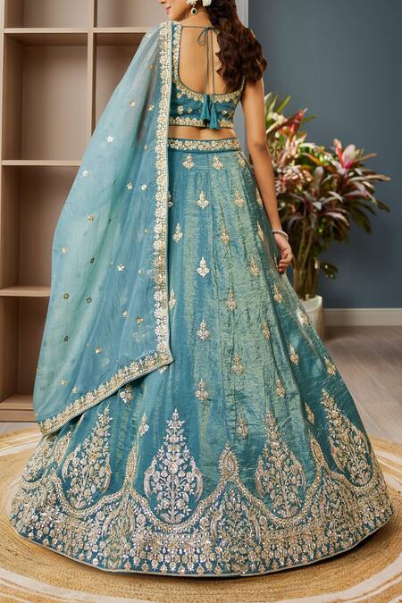 Blue lehenga featuring intricate embroidery and an attached can can. Paired with a matching blouse and dupatta adorned with tassel details.