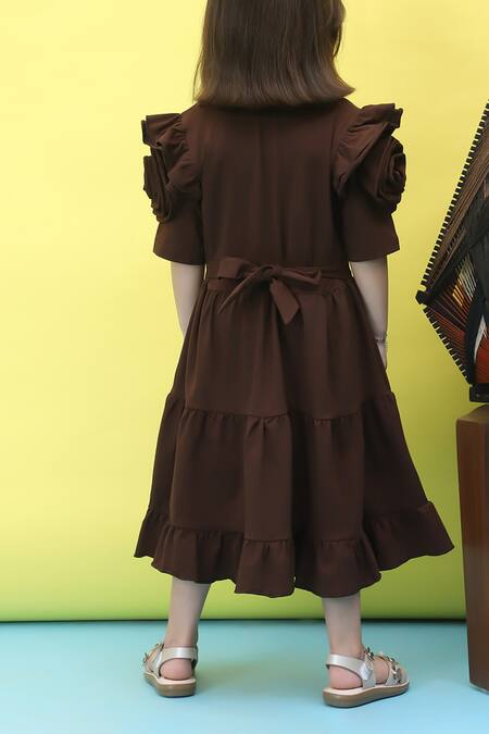 Brown knee-length dress featuring rose sleeve detailing and a tiered ruffle hem