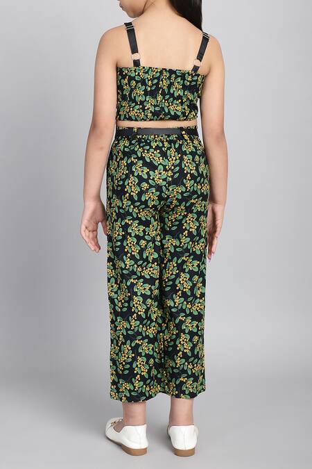 Green co-ord set featuring a floral printed top with adjustable straps and matching pants. Made from cotton, the set offers a relaxed fit for comfort.
