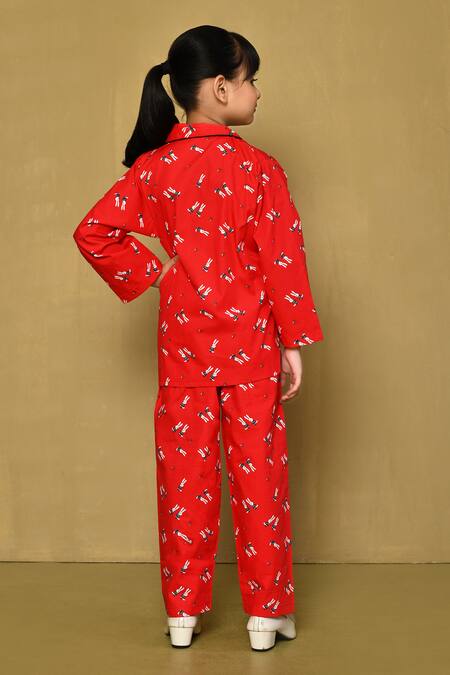 Red shirt featuring an all-over bunny print and collared neck. Paired with matching pants for a complete night suit.