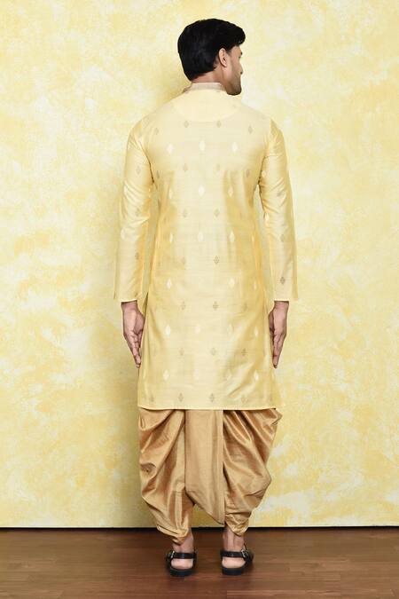 Light yellow kurta featuring full sleeves, mandarin collar, and intricate buttercup bloom embroidery. Paired with a matching dhoti pant in art silk fabric.