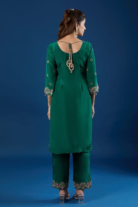 Dark Green crepe kurta featuring hand embroidery with zardozi, thread, and crystal butti motifs, and a lining. It is paired with dark green crepe straight pants and a dark green organza dupatta, both adorned with matching hand embroidery.