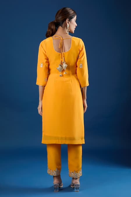 A saffron yellow crepe kurta featuring gotta and zardozi hand embroidery with butti motifs. It is paired with a saffron yellow chinon dupatta and saffron yellow crepe straight pant, both adorned with matching hand embroidery.
