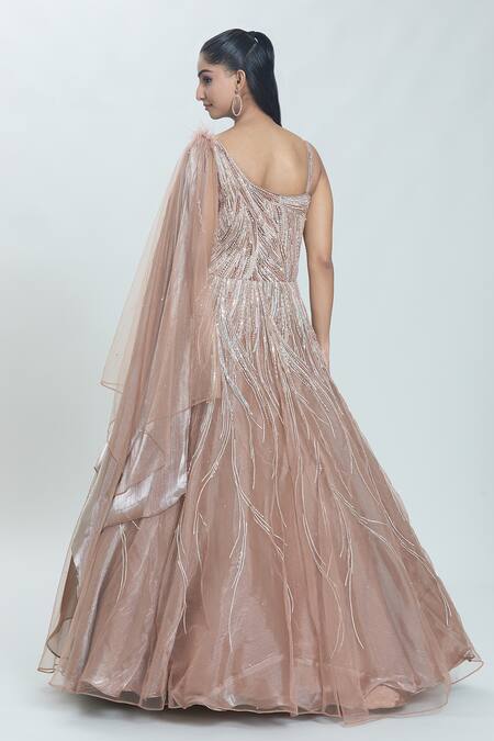 Mouse brown one shoulder gown featuring asymmetric wing sleeves and celeste wave embroidery