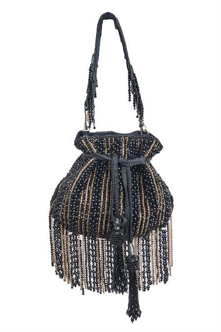 Black potli bag featuring intricate glass beads, stones, and chain mesh embellishments