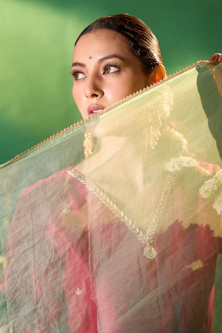 A cherry magenta Chanderi Silk kurta with a V-neckline features hand embroidery details and lining. It is paired with coordinating cherry magenta pants with an elastic waistband and a green dupatta.