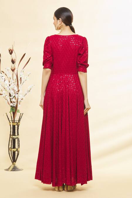 Red anarkali featuring embroidered chikankari motifs highlighted with sequins. Paired with a plain dupatta with gota lace borders.