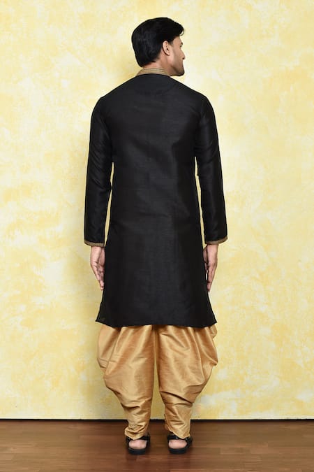 Black kurta featuring contrast embroidery around the placket. Paired with chikoo patiala pant with an elasticated waistband.