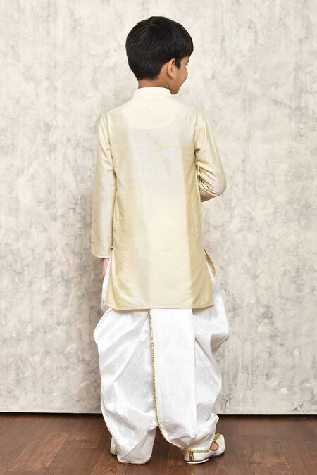Cream cotton silk kurta featuring a mandarin neckline and stone buttons. Paired with white dhoti pant with an elasticated waistband.